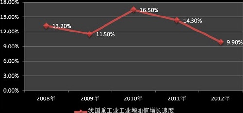 受到國際經(jīng)濟環(huán)境變動的影響,我國重工業(yè)在迎來高速發(fā)展期之后,其行業(yè)增速于2012年初開始有所放緩,呈現(xiàn)增長下滑的態(tài)勢,其主要的冶金礦山機械行業(yè)、物料搬運設備行業(yè)、礦山機械行業(yè)等增長情況亦受到影響。