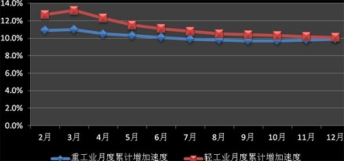 2012年我國重工業(yè)發(fā)展較為平穩(wěn),月度累計工業(yè)增加值增長率最高為3月的11%,最低為9月的9.7%。長期以來,我國重工業(yè)發(fā)展速度一直快于輕工業(yè)的發(fā)展速度,但受到內(nèi)外經(jīng)濟增速放緩、內(nèi)需不足等因素影響,2012年我國輕重工業(yè)發(fā)展出現(xiàn)倒置現(xiàn)象。2012年2月,我國輕重工業(yè)工業(yè)增加值月度累計增加速度為12.7%、10.9%,至12月則發(fā)展為10.1%、9.9%。整體上看,雖然我國重工業(yè)發(fā)展增長速度落后于輕工業(yè),但是其差距在逐步縮小。